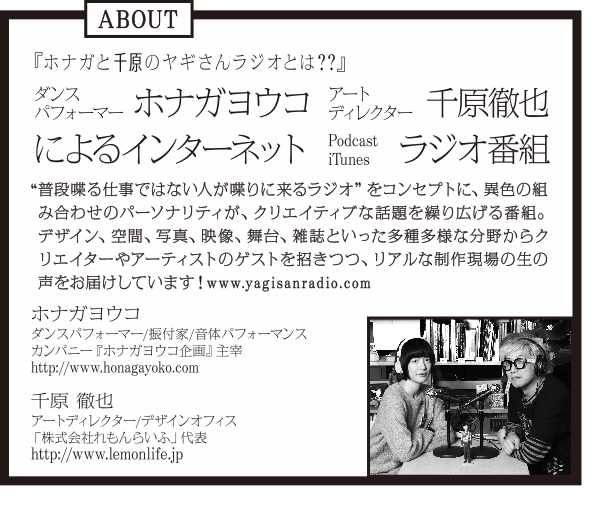 ダンスパフォーマーとアートディレクターという異色の組み合わせのパーソナリティーが、クリエイティブな話題を繰り広げるインターネットラジオ番組『ホナガと千原のヤギさんラジオ』。多種多様な分野からクリエイターやアーティストのゲストを招きつつ、リアルな制作現場の生の声をお届けしてきましたが、この度、外苑前の「WORK WORK SHOP」にてルミネとコラボしたイベントを行います!ラジオの公開収録はもちろん、豪華ゲストによるトークショー、ライブなど、盛り沢山な内容の1日をお届けします!過去のラジオのアーカイブを振り返る事のできる展示ブースでは、ゲストの皆様全員の登場回も聞くことができます。みなさまぜひお立ち寄り下さい!