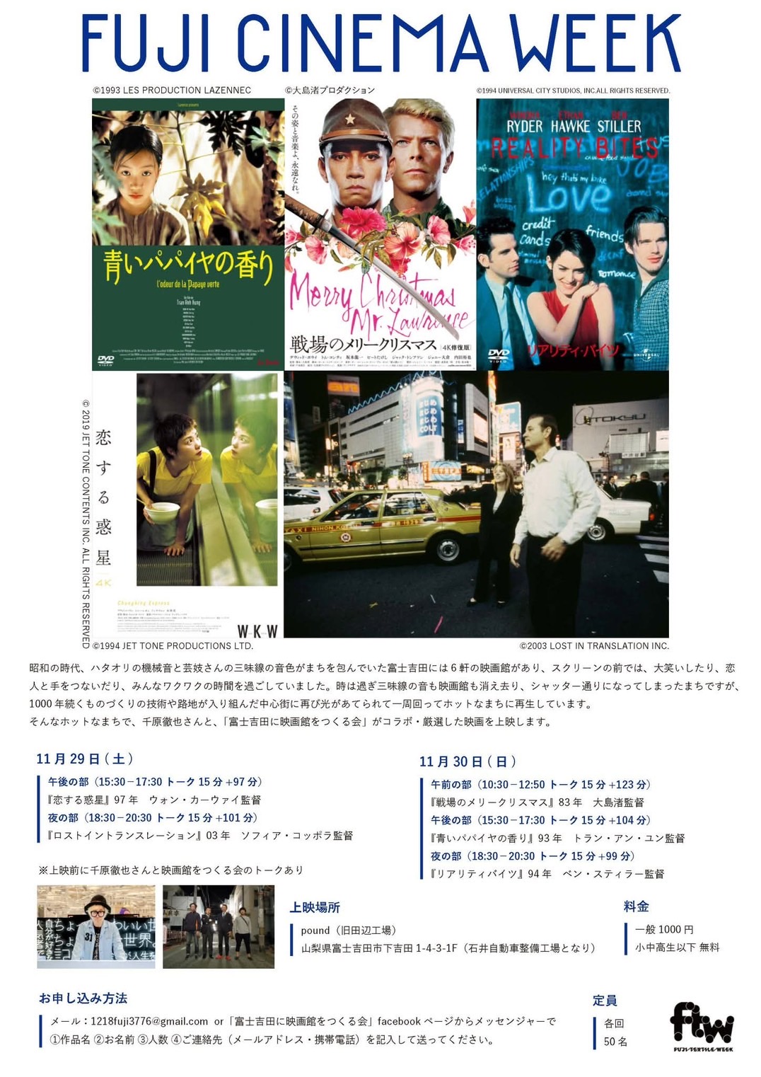 News November 07 2025 11月29日(土)「富士吉田に映画館を作る会」とコラボし、千原徹也がトークショーをします! 11月29日(土)・30日(日)に富士吉田市の「pound(旧田辺工具)」で千原徹也と、「富士吉田に映画館をつくる会」がコラボ!「恋する惑星」や「戦場のメリークリスマス」など厳選した映画を上映します!詳しくはこちら Tweet