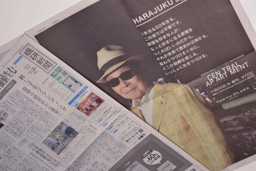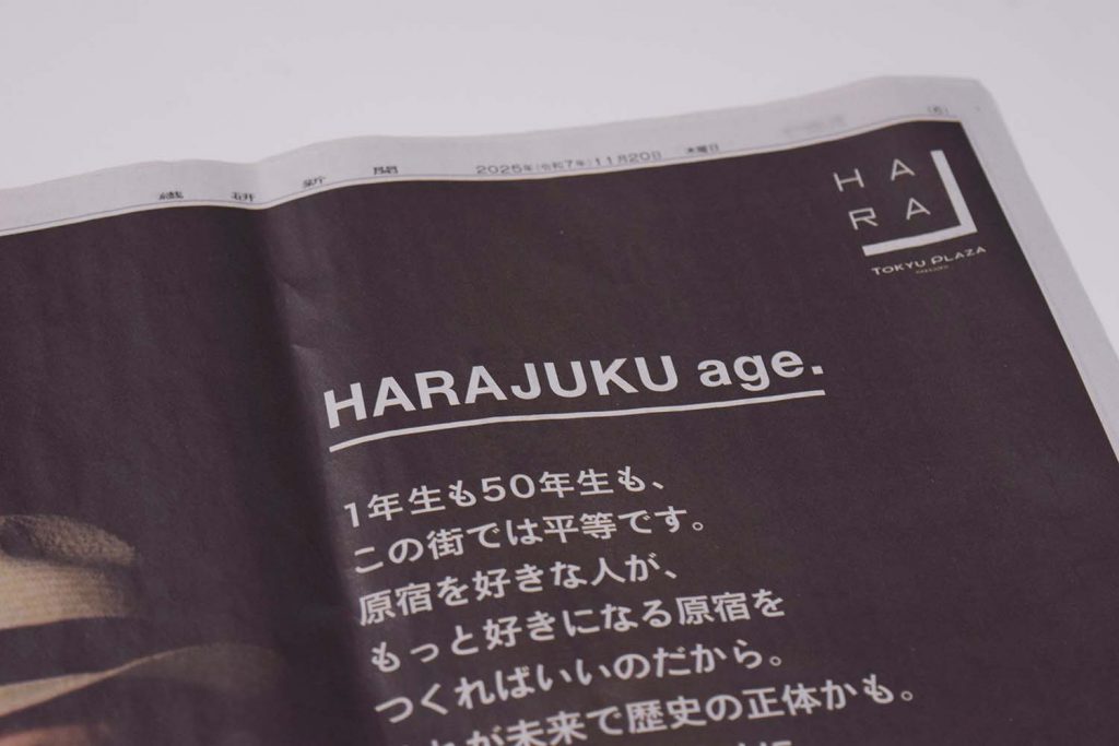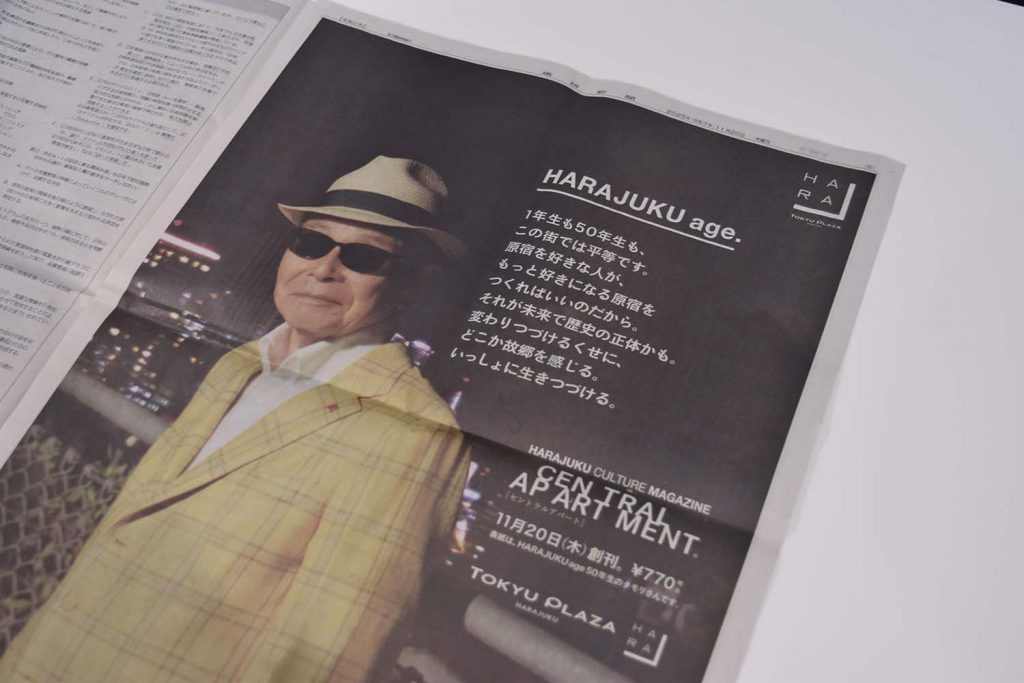 原宿カルチャーマガジン『セントラルアパート』の発売にあわせ、原宿を愛する人、そしてこれから好きになる人に向けた広告『HARAJUKU age.』のアートディレクションを担当。オモカドおよびハラカドを中心に原宿の交差点をジャックし、さらに繊研新聞では12段広告として大きく掲出された。